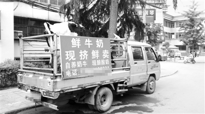 近日,在市中区的不少小区内,都可以看到一辆拉着奶牛的货车,牌子上“鲜牛奶现挤鲜卖”的文字非常惹眼。