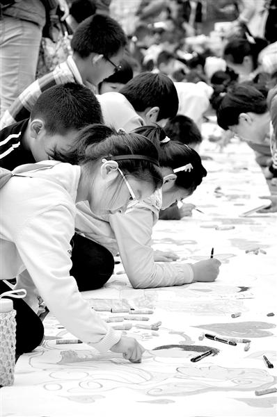 在活动现场,小朋友们在家长的带领下,拿起画笔在“百米画卷”上绘画出母亲的样子,发挥自己的想象力,表达对母亲的感恩之情,写下一句句对母亲的祝福。