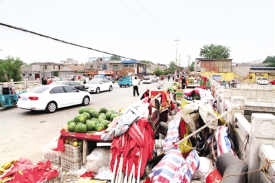 市中区东沙河中游的周庄大桥是座景观桥,自建成后就成了“蔬菜市场”,蔬菜、各种运输工具等摆满桥面,不但影响桥面车辆通行,还影响景观桥的美观效果。 (记者 孙明春 摄)
