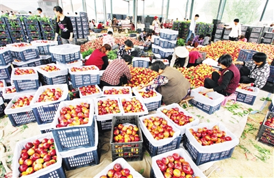 6月6日,果农在分装春雪桃。山亭区冯卯镇是远近闻名的蜜桃之乡,三万多亩桃树在果农的精心护理下喜获丰收,种植的春雪桃、黄金蜜、宏海蜜等优良鲜桃吸引全国各地批发商前来。(记者 孙明春 摄)