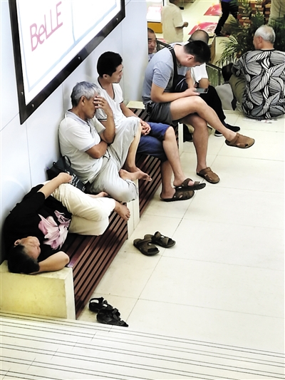 在三角花园一大型商场内的一二楼之间的楼梯上,坐满了前来纳凉的市民。由于供给市民休息的椅子太少,很多市民直接席地而坐,坐在楼梯上聊着天或是玩着手机。走近这些纳凉的市民,记者看到不少市民直接把鞋子脱掉,光着脚乘凉。在楼梯两侧的座椅上,有两位市民分别占据着一个长椅,把鞋脱掉后直接躺在上面睡觉。在二楼和三楼之间的楼梯处,记者看到更令人惊讶的一幕,一位老人上身光着,脚也是光着的,低头坐在椅子上休息。这两层楼梯上的椅子上共有四五十人在纳凉,记者发现有近三分之一的市民光着脚。