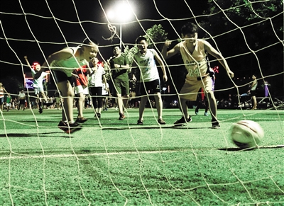 8月7日晚,孩子们在山亭区锦绣花园社区多功能运动场踢足球。近年来,该区在273个村(居)实施全民体育健身工程,并培训社会体育指导员,实现了城乡锻炼有场地、健身活动有器材、身体素质有提高。 (特约记者 李宗宪 摄)