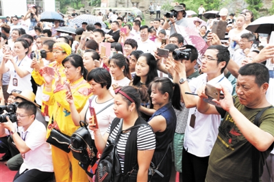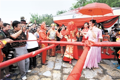 活动现场,青年男女展示着各自的风采,洋溢着青春的气息,现代婚纱模特走秀、相亲青年情歌对唱、“爱情对对碰”抢凳子、微信摇一摇抽大奖等活动,引来观众的加油声以及此起彼伏的喝彩声。另一边,铜锣开道,唢呐吹响,身穿红色状元服的新郎,骑着枣红色大马前来迎亲,在媒人的引领下,将新娘接上了花轿,上演了一场浓郁的、具有中国传统特色的中式大花轿婚礼,将活动推向了高潮。