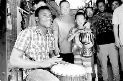 8月12日,在台儿庄古城非遗一条街,来自非洲的山大留学生三体在表演非洲鼓。当日,三体和来自索马里的同学艾哈迈德一起参观了古城内的剪纸、制陶、木雕等非物质文化遗产,两位国际友人对中国文化赞叹不已。