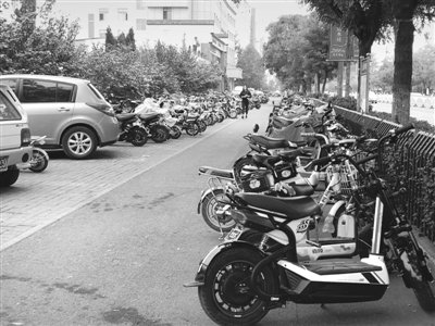 26日下午14时左右,记者来到位于市中区文化路上的四十一中,该校校园内东侧有一个自行车棚,里面整齐地停满了自行车。而在学校外,几百辆电动车摆成了两条长龙。不过停放秩序还比较好,中间留出了过道。周围一家商店的老板告诉记者,这些电动车都是该校学生停放的,学校不允许骑电动车,他们就偷偷骑,“统一”放在路边。该校的一位保安告诉记者,学校规定,学生可以骑自行车,但不能骑电动车,因此学校只负责帮学生保管自行车,而电动车则无人保管。