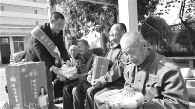 10月8日,滕州市爱心人士刘合龙到滕州市光荣院看望这里的抗战老兵,为他们送去购买的牛奶、鸡蛋、水果、米、面、食用油等物品。