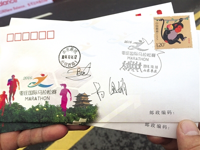 近日,中国邮政集团公司枣庄分公司专门发行了枣庄国际马拉松赛纪念封一枚,并刻制了纪念邮戳。该纪念封由徐利设计,纪念戳由任怀平设计。石榴、荷花、古城等枣庄元素均出现在了纪念封上,具有较高的收藏价值。 (记者 孔浩 摄)