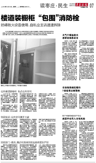 既然有业主随意在楼道内打造橱柜,小区的物业没有制止么?记者采访了高新区几家小区物业的负责人,从他们那里记者了解到,随着时代的发展,人们逐渐意识到公共空间的重要性,开始将目光瞄向了公共楼道。可是公共楼道毕竟也是消防逃生通道,不能只顾实用却忽略安全问题。于是几乎每家物业公司在发现业主在楼道打造橱柜的,尤其是在消防栓周围打造橱柜的,都会出面制止对方。然而遗憾的是,由于物业公司没有执法权,不能对业主搭建的违章建设强制拆除,因此也就不能百分百制止业主的肆意妄为。只能将情况反映到社区街道或者相关部门。