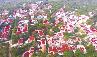 金秋十月,峄城区阴平镇的枣树种植户迎来了丰收,纷纷将收获的红枣晾晒在房顶、门前。从空中俯瞰,村庄犹如披上了红色的锦缎,构成一幅美丽的农家“晒秋图”。图为昨日在阴平镇斜屋村航拍的晒枣图。