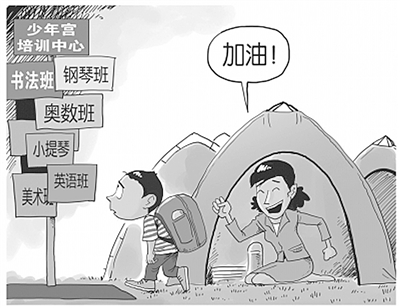 16日,杭州少年宫的地上搭了23个帐篷,里面吃的喝的睡的装备齐全——很多学生早上、下午都在这里上兴趣班,为免去来回接送、让孩子中午能睡一会儿,父母就把必需品都搬来这里了。更多时候是家长在里头看书、玩手机、睡觉,等着自己的孩子。