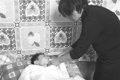 “快救救我的孩子吧,只要能救活我的孩子,让我做什么都行。”在峄城区峨山镇李堡村韩军平的家里,母亲周广清一边流眼泪,一边照顾着躺在床上的孩子。