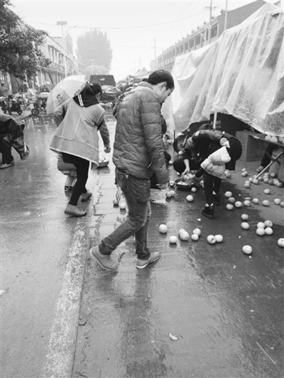 当日中午一点钟左右,天空正飘着小雨,滕州的神先生和妻子驾驶一辆满载苹果的货车,来到了邹坞镇赶会。当他们行到兴盛路邮政局北时,忽然听到车窗外有人喊叫,让他们停车。待神先生和妻子从驾驶室中走下来,这才发现车斗后挡板由于没有关好,致使车中的苹果滚落到了车下,二十余米长的马路上一时到处都是苹果。正在这时,路边上的几位行人看到苹果落了一地,都赶紧停下了脚步,和在集市上摆摊的几位摊主,利用自己手中的塑料袋等工具,开始弯腰捡拾苹果。神先生见状很是焦急,害怕他们趁乱哄抢他的苹果,在束手无策中他质问捡拾苹果的这几个人想干啥。一位男青年哈哈一笑说:“我们帮你捡起来。”在半信半疑之中,神先生看到远处的几位青年人拿着捡拾起来的苹果来到了他的车前,将苹果放到车斗中后又弯腰拾了起来。一位妇女带着儿子从此经过,看到这种情况后,娘俩也主动加入到了捡拾苹果的队伍中。此时小雨还在哗哗的下着,但帮忙捡拾苹果的几位好心人却没一个退却的,为了帮助神先生捡拾地上的苹果,他们丝毫没有顾及自己的衣服被淋湿。