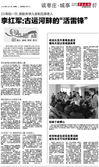 2012年12月13日晚8时许,台儿庄区润国超市发生火灾,李红军正好路过此处,一边协助消防官兵找水源,一边向领导汇报,单位职工和部分专武干部到达现场后,协助公安干警劝说群众离开火场周围,直到深夜十一点半才离开。“记得当时有商户不愿意离开,我在大火旁也很着急,毕竟很多商户的钱财都在里面,我只能苦苦劝他们,钱没了可以再挣,人没了就啥都没了。”李红军回忆说。在他的劝说下,商户没有一个人冲进火海,保障了人民生命的安全。