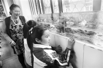 瞧,小金鱼游得多开心!原来,文化路小学二年级九班家委会的家长们集资专门为孩子购置了金鱼缸,鱼缸里还有海草,有礁石,课余时间看着小金鱼自由自在地游来游去,孩子们别提多高兴了。 (记者 孙慧英 摄)