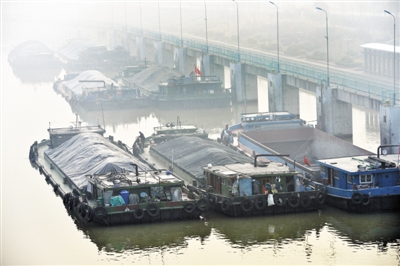 昨日,在京杭运河台儿庄段,多艘船只停靠在航道等待过闸。当日,该航段笼罩在雾霾之中,能见度一度低于50米,市航运部门临时关闭船闸,及时通过广播、公告屏向过往船员公布水位、雾霾等信息,提醒船员寻找安全地点就近停靠,待水面能见度较大后再正常航行。