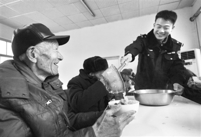 昨日,在山亭区城头镇敬老院,青年民警志愿者为孤寡老人送去腊八粥,并和老人们一起欢度“腊八节”。