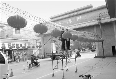 1月24日,工作人员正在忙碌着布置灯笼。每年春节前后,新中兴公司的中兴门内都会挂满灯笼。那一排排大大小小的灯笼连在一起很是壮观和喜庆,晚上灯亮起来,成为了一处让人赞叹的风景。