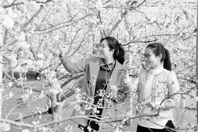 1月24日,游客在拍照留念。随着新春佳节的来临,山亭区北庄镇1000多个种植樱桃的温室大棚里,樱桃花次第开放,一棚棚、一簇簇,散发着馨香,樱花迎春开,喜迎新年的到来。 (记者 孙明春 摄)