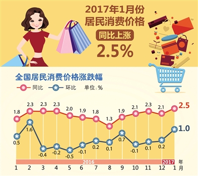 国家统计局14日发布的2017年1月份全国居民消费价格指数(CPI)数据显示,CPI同比上涨2.5%,环比上涨1.0%。