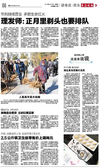市中区解放路上的一家理发店的老板表示:“非要说在意的,那也是家里的老年人比较在意这些传统习俗,一般过年之前,都会给家里的小孩理发、洗澡。但主要是想让小孩子精精神神地过年,很少有刻意为了正月不剪头,才提前剪头发的。年轻人不太在意这些,我初六开门就有顾客来理发。”随后,记者走访我市多家理发店,店主均表示过年以后,生意并没有受到旧习俗的影响,预计在农历二月二那天还是会迎来理发小高峰。