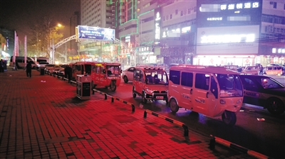 晚报讯 (记者 姚付林 摄影报道)近日,气温回升,滕州市步行街逛街的市民也多了起来,可步行街与荆河路交叉口公交站附近,成了很多载客电动三轮车的“集散地”。有公交车进站的时候,电动三轮车车主一拥而上,抢拉生意。这些非法运营的电动三轮车车主,甚至将该区域“划”成了他们停车待客“专属区域”,不准其他车辆停靠。来此处逛街的市民党女士前两天就被这些电动三轮车车主给堵了路,报警后才得以离开。