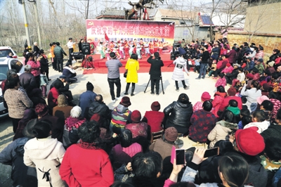 2月27日上午,齐村镇柏山村村民聚在一起,观看了一场接地气的文艺演出。演出是该村曹栋宜自费自编自导的,演员都是十里八村的农民,19个节目里歌曲、戏曲、小品都有,引得乡亲们喝彩声连连。 (记者 王震 摄)
