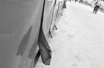 这些翘起的广告牌,大部分是从下面的边角处裂开,铁皮与铁皮之间的接缝处看起来衔接并不牢固,上面贴了不少野广告无人清理。