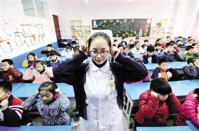 3月2日,河北省邯郸市第三医院的医护人员带领农林路小学的学生们做耳保健操。