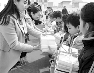 5日,市新华书店鲁南书城工作人员带着各类儿童读物,来到西王庄镇东王庄小学,将图书赠给留守儿童,还和他们一起做游戏,进行互动联欢。 (记者 孙明春 摄)