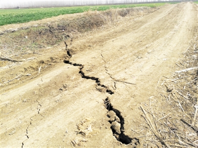 不远处,几位村民正站在田间地头议论着,经询问得知,这儿就是5日下午地面下陷的中央地带。一位村民向记者介绍,“昨天下午,我们村的一个妇女正在地里干活,突然感到地面摇晃,开始她以为地震了,脚底下的农田也出现了裂缝,就吓得她赶紧扔掉扒犁,逃离了现场。”这位村民指着一片麦地说:“你顺着塌陷处往北看,原来那块地没塌陷之前,是和河沿边齐平的,今天我们来到地边发现,附近农田及道路明显比前一天凹了不少,因为下陷严重,原本向南流淌的河水,也开始向北回流了。附近原本干涸的沟渠也开始有水了。”记者在村民反映地面向外喷水的地方看到,处在路面上的裂缝尤其严重,足以放下一个成年人的拳头,深约1米多。