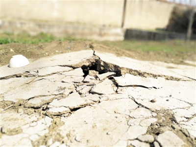 6上午10时许,记者来到台儿庄区泥沟镇冯湖村,根据村民的指引,记者前往事发地时,却被一道铁丝网门挡住了,门上标注着“前方塌陷 禁止入内”的字样。绕过铁丝网门继续前行,记者发现,在通过事发地的田间小道上,每隔几米就有一条贯穿小道的裂缝。在一老旧房子处,房子东面和北面院墙出现严重的裂缝,院墙与地面连接的地方出现贯穿裂缝,随时都有倒塌的可能,院子东北角的院墙甚至倒塌了一块。“这些裂缝都是昨天下午地面下陷造成的,东北角已经倒了,东面和北面也随时可能倒。”一正在收拾东西的村民告诉记者,他是负责看守该处的,平时都是吃住在这儿,5日,该处地面出现下陷时,正巧他不在,等他回到这儿时就发现房子院墙变成了现在这样。“房子也不敢住了,现在准备搬离这儿。”随后,记者在该院内看到,院内的水泥地面也出现了大小不一的裂缝。