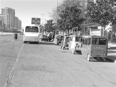 2月28日,记者在滕州市益康大道19路公交车骨伤医院公交车站点看到,数辆机动三轮在公交站旁一字排开,等待载客。一辆公交车欲驶入站台时只能停在路中间,市民乘车要到路中央上下车。不少市民希望有关部门能够及时清理载客三轮,确保市民乘车安全。 (记者 王晨曦 摄)