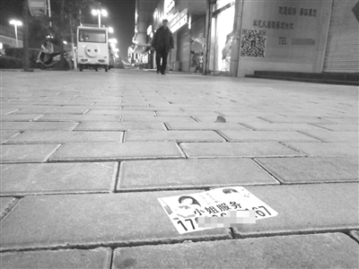 随后,记者在市中区建设路上的一处地面,同样发现了类似的广告,但与先前不同的是,这种小广告是用黑色加粗字体写着“包小姐”,广告的底部留有一个联系电话,并且联系方式也与先前的不同。