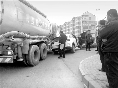 3月30日,在高新区祁连山路与嫩江路路口,一辆干混砂浆车和一辆白色的私家车在右转的过程中竟然撞到了一起,白色私家车被挤上路边的绿化带,不过幸运地是两方均没有人员受伤,只是车辆出现了剐蹭。