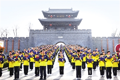 近日,台儿庄古城内上千名少年儿童“忆先烈·诵家书”,通过向革命先烈敬献花、举行民间鼓乐表演、战地家书诵读等活动,在文明和谐的氛围中让广大市民和游客感受了中国传统文化的魅力。 (特约记者 高启民 摄)