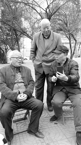 市中区立新小区85岁的文庆珍老人,使用智能手机一年多了,上网玩微信、使用滴滴打车软件等都非常熟练,他经常在小区花园处向老人们传授如何使用智能手机上网。 (记者 孔浩 摄)