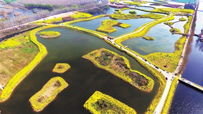 近日,台儿庄区邳庄镇涛沟河景区赵村湿地的3000亩油菜花全面进入盛花期,吸引了大批附近游客前来踏春赏花。 (特约记者 高启民 摄)
