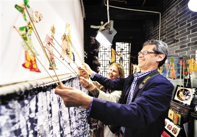 4月6日,在台儿庄古城景区,国际摄影艺术联合会秘书长利库里斯陶醉于皮影戏之中。原来,古城依托抗战文化、运河文化、鲁南民俗文化等资源,以特色文化旅游,吸引了海内外艺术家前来采风。 (特约记者 高启民 摄)