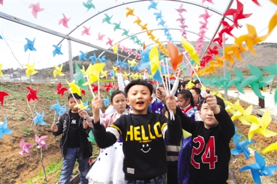 4月9日,由农民“种植”的数万座造型各异的七彩风车,在温泉小镇北侧农田内营造出一个浪漫的童话世界。文化路小学二(9)班的孩子们在老师和家长的带领下,在风车的海洋里唱歌、制作小风车,度过了一个难忘的休息日。 (记者 孙慧英 通讯员 孙晋伟 摄)