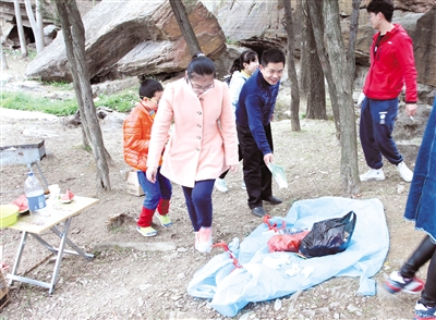 9日,在峄城区贾泉村,几位游客烧烤完后带走产生的垃圾,希望用自己的行动,带动更多的人文明烧烤、保护环境。