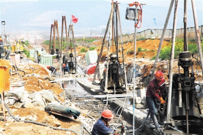 4月13日,工程人员进行大坝防漏钻孔施工。庄里水库是国家批复在建的重点水利工程,水库大坝防漏钻孔灌浆施工标志着工程即将进入大坝主体上土施工阶段。 (记者 孙明春 摄)