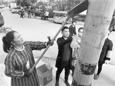 14日下午,市中区垎塔埠街道对辖区主要小区街道进行环境整治。铲除野广告、清运垃圾,使得小区环境得到改善。 (记者 王龙飞 通讯员 张超 李甜 摄)