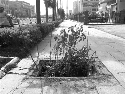 “就是怕有人再掉进去了,我们就找了些树枝插在里面。”这位商户说,虽然白天树枝能起到提醒行人安全通行的作用,但他们还是担心晚上因光线不好,很可能会有人再掉进去。
