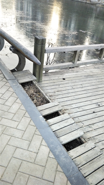 “上次看到有人在木栈道上跑步,一不小心脚踩进了缺失木条的坑里,脚崴了,后来为了防止再出现这种情况,有人就拿砖块垫上了。河边缺失的木质护栏,有人扯来红绳,贴了警示语,希望不知情的人不要倚靠栏杆,以免发生危险。也不知道该哪个部门管,真希望快点把这些坏了的地方修好,大家也能有个安全散步的地方。”临河路上一家商店的店主张老先生说。