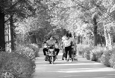 王女士表示,每到下午四五点钟,这里就聚集了一些锻炼身体的市民,有的慢跑,有的三五人聚在一起边聊天边散步,还有的带着小宝宝来到这里玩。树荫下花草旁边的一条小道上从这时开始热闹非凡。但是从这时候开始,不仅锻炼游玩的人多了,骑着电动车、自行车的市民也多了起来,原本不宽敞的小路上遇到这些骑着车子的市民,锻炼的人还得刻意去躲避。