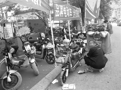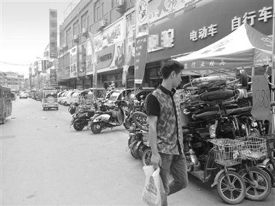 中天步行街北段,数十个电动汽车销售点的占道经营真可以用“猖獗”来形容。5月1日,恰逢节假日商家促销,当天中午,众商家都卯足了劲儿,希望能够在当天有个好业绩。为此,经营者们纷纷将新款的电动车摆放在门前道路上,有的甚至仅留一条小小的过道供车辆通行,店外只要有空地全部摆上了电动车。记者在现场注意到,该路段原本有近20米宽,可经过两边的商家占道,仅还剩数米宽。别说顺利通过汽车了,就连两轮电动车在此行驶时,都得特别小心,生怕剐蹭到过往的行人。而除了店外摆放电动车外,一些经营者也干脆在店外干起了组装和修理的工作,而这下更是将道路挤的还剩不到5米,车辆根本无法正常通行。