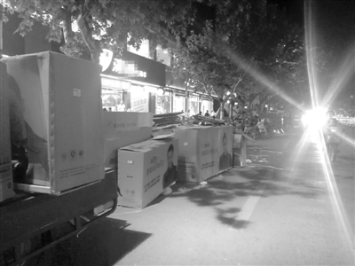 在文化北里小区南北两侧,均有几处占用人行道摆摊的情况。在文化北里小区南面,有一家经营电动车的店面,也是将绝大多数电动车辆摆在了该路段东面的人行道上。在该小区大门北侧,一家超市将所售商品摆放在门口,各种空箱子相连,几乎将整个人行道堵住,行人若想从这儿经过,就得穿过各种饮料箱子排成的“箱阵”。从这往北,一家新开的电动车经营点的店外经营则更严重一些,不仅占用了路西侧全部的人行道,而且还将东侧仅有1.5米左右的窄道也给占用,摆满了电动车,行人根本无法从此处经过,只得走下面的混用车道。再往北,一家收售二手家电的店面同超市一样,也是将其所有的产品都竖着排在店门前,旁边的一家花草店虽然未开门,但花草却摆在了门前,占用了公共道路。