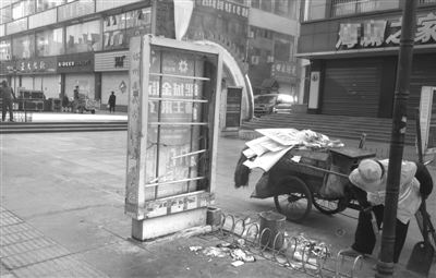 近日,在滕州步行街南头,竖在道路中间的灯箱广告的玻璃被人砸坏,里面电线凌乱,其中有灯管破碎。 (记者 姚付林 摄)