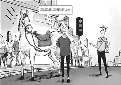 近日,江苏省徐州市淮海东路上有一匹大白马出现在闹市区,吸引了很多人围观。交警询问牵马的男子,男子回答:“马路,马路,马当然可以走了”。原来,这匹白马是要送到市区某剧场进行表演,男子为了吸引更多人就直接带着马进了市区。《现代快报》5月8日)