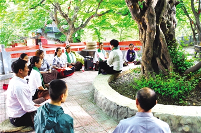 5月7日,茶艺师在进行禅茶表演。当日,市瑜伽协会组织会员到峄城区青檀寺景区举办“户外禅修”活动,大家以茶会友、以茶联谊、融入了“自然、健康”的生活理念。 (记者 孙明春 摄)